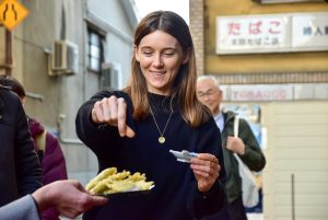 地元の人達が多く利用する三条会商店街をガイドと一緒に歩いて周り、美味しいものを食べながら、日 本の普段の暮らしを紹介します。京都で有名なお肉屋さんからスタートし、様々なお店を周り、店内で体 験をしたり、店主とのコミュニケーションを楽しみながら各店自慢のグルメを味わえます。途中神社など にも寄りながら、約800メートルの商店街を2時間かけて歩き、観光地では味わえないごく一般的な京都 の人々の暮らしを楽しんでいただけるツアーです。
